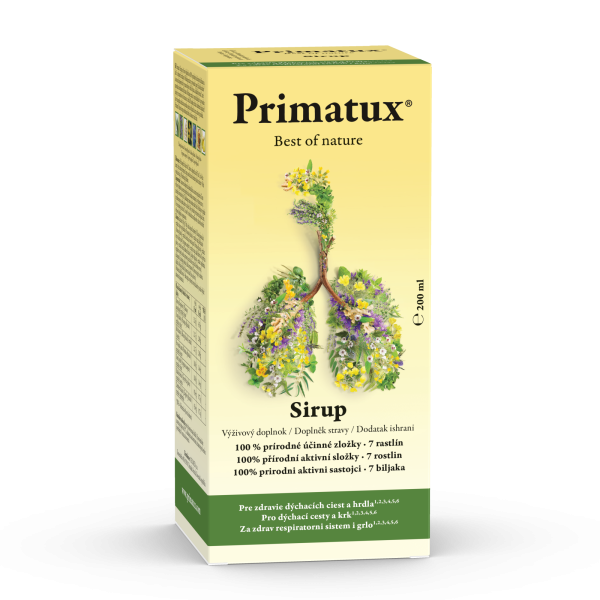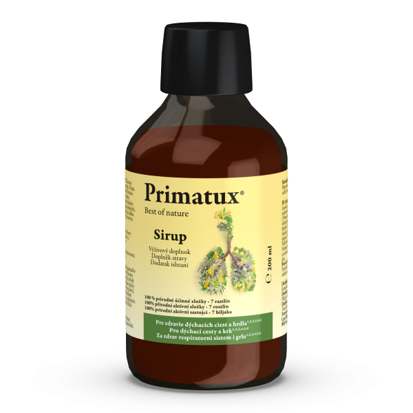 Primatux® Sirup je výživový doplnok so 100 % prírodnými úcinnými zložkami na báze 7 rastlinných extraktov. Obsahuje extrakty z prvosienky jarnej, ibiša lekárskeho a skorocelu kopijovitého pre starostlivost o hrdlo a hltan, a sladkého drievka, ktoré napomáha normálnemu dýchaniu. Obsahuje extrakt z yzopu lekárskeho a prvosienky jarnej pre starostlivost o sliznicu úst a hrdla. Obsahuje extrakt z dumbiera lekárskeho, ktorý napomáha udržiavat normálnu sekréciu dýchacích ciest a zdravie priedušiek.